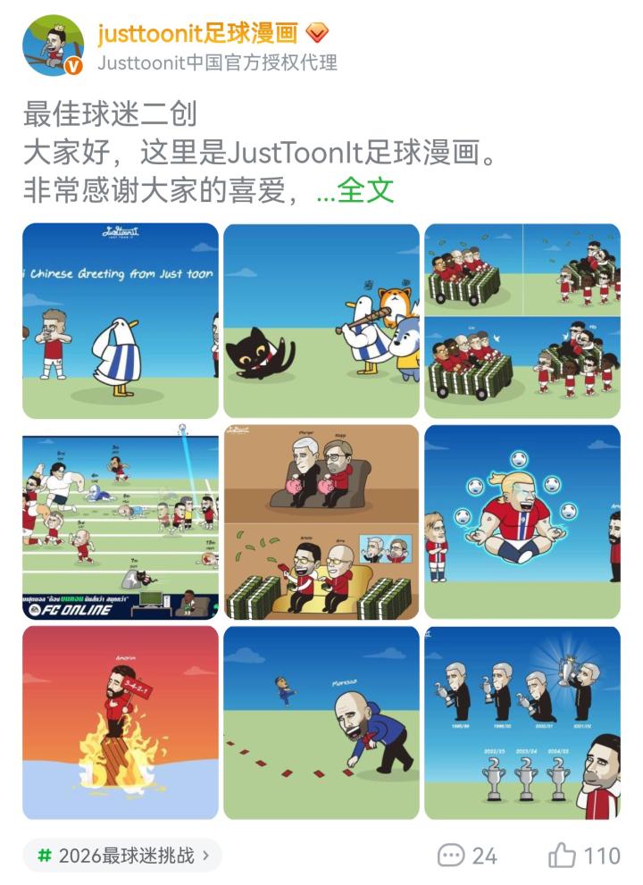 @JustToonIt足球漫画 从不只追一场比赛,他的画笔跨越赛果、追踪动态。他的创作版图像一张实时更新的英超地图:有战术,有梗图,陪伴大家走过每一场比赛。此次最球迷挑战,我们特邀了JustToonIt漫画作者更是为大家揭秘自己速更的秘诀,快来为他点赞吧~