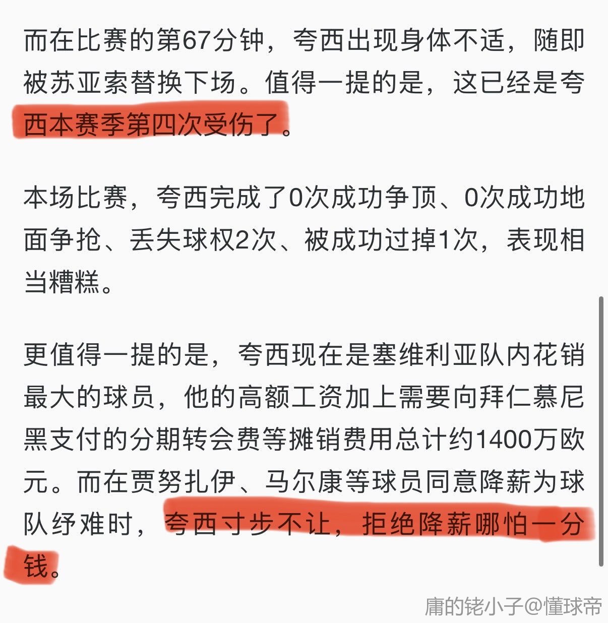 更值得一提的是,夸西现在是塞维利亚队内花销最大的球员,他的高额工资加上需要向拜仁慕尼黑支付的分期转会费等摊销费用总计约1400万欧元。而在贾努扎伊、马尔康等球员同意降薪为球队纾难时,夸西寸步不让,拒绝降薪哪怕一分钱。