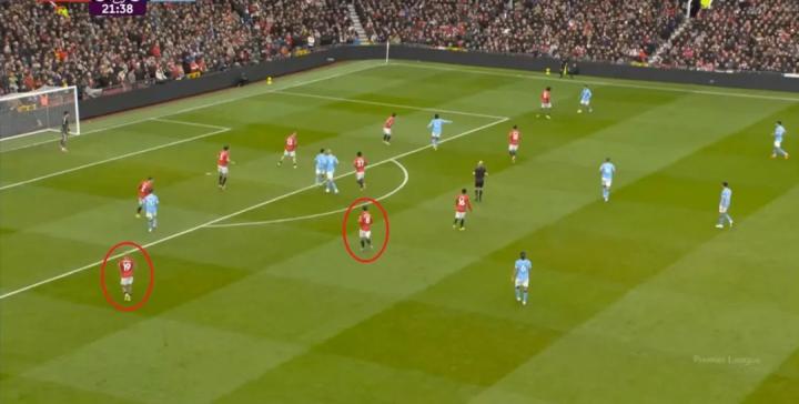 反击的起跑线前,曼联甚至无需额外自己制造空间,只需要姆贝乌莫和布鲁诺不断移动,在罗德里身侧、中卫身前的区域就有很大的机会接到球,紧接着就可以联系到多尔古和阿玛德-迪亚洛所在的边路,就可以带着速度和冲击力冲向曼城的门前。