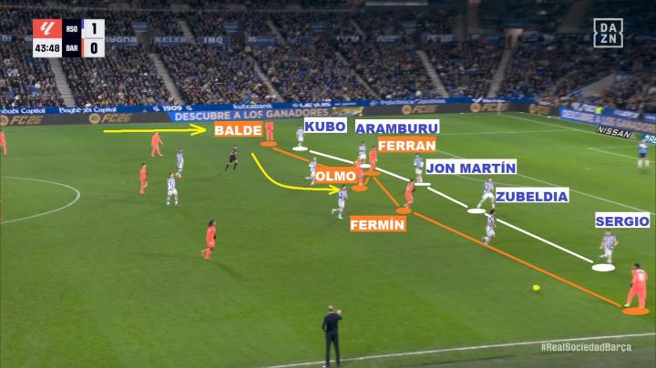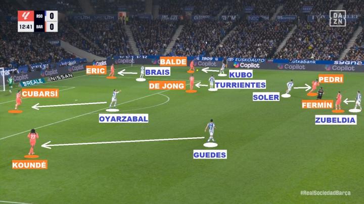 整场比赛,皇社几乎从未摆脱巴萨的压制。如果有的话,也仅仅是在将比分改写为 2-1 后的短短几分钟内。但也必须承认,在上半场中段,皇社至少成功调整了他们的高位防守。这并非马塔拉佐进行了什么复杂的战术演练,这种好转更多是源于向所有参与压迫的球员灌输了一个理念:毫无畏惧地追踪各自的盯人对象,从而消除对手任何位置上的优势。卡洛斯·索莱尔开始果断地扑向德容;苏贝尔迪亚也同样对上了费尔明。虽然依然处于劣势环境,但蓝白军团至少看到巴萨不再能轻易地在中路转身并迫使他们向后奔跑。