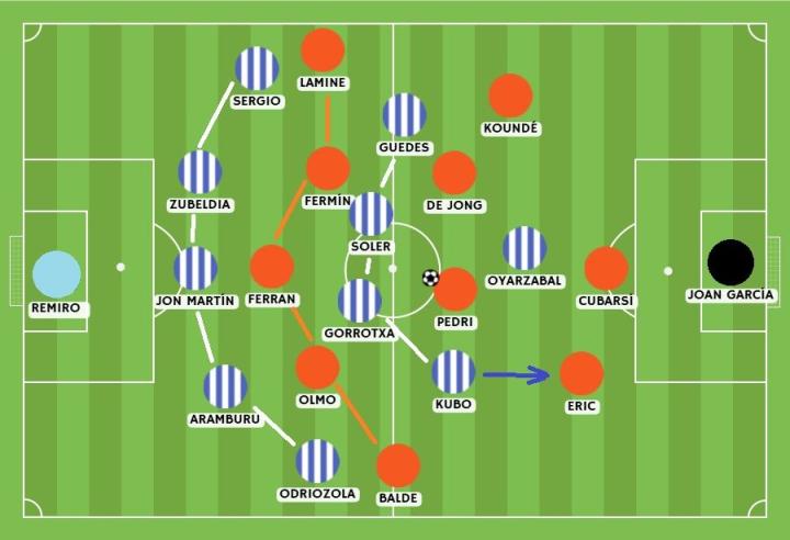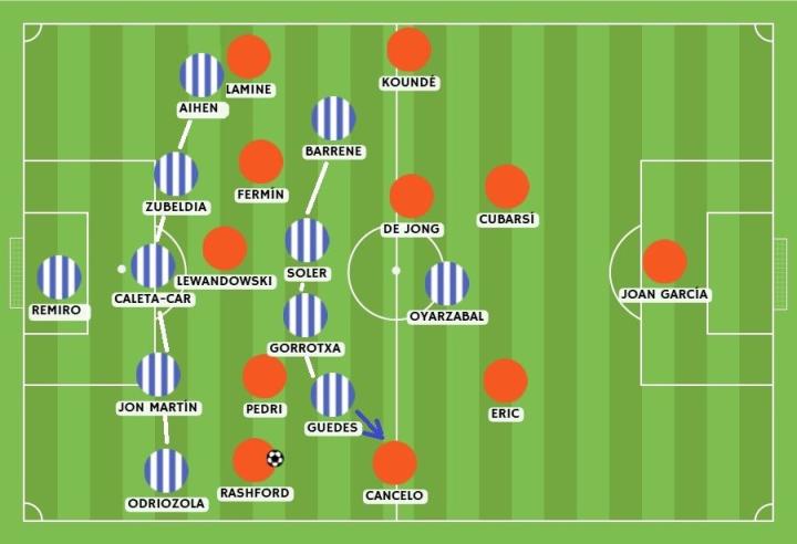 皇社在压迫防守的结构上几乎没有任何改变。当他们决定发起侵略性逼抢时,蓝白军团采用的是 4-4-2 阵型:布赖斯·门德斯顶在第一线(与奥亚萨瓦尔平行站位);而面对巴萨的 4-2-3-1 阵型,苏贝尔迪亚负责修正中场中路理论上的人数劣势(他必须前顶,去对位巴萨的前腰费尔明·洛佩斯)。