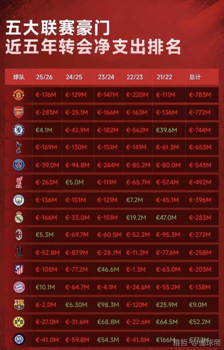 继续补充阵容 也不用说瓜瓜只能花钱 有的队花钱也没成绩 何况花的比曼城还多 截止去年夏窗结束 净投入big6倒数第一