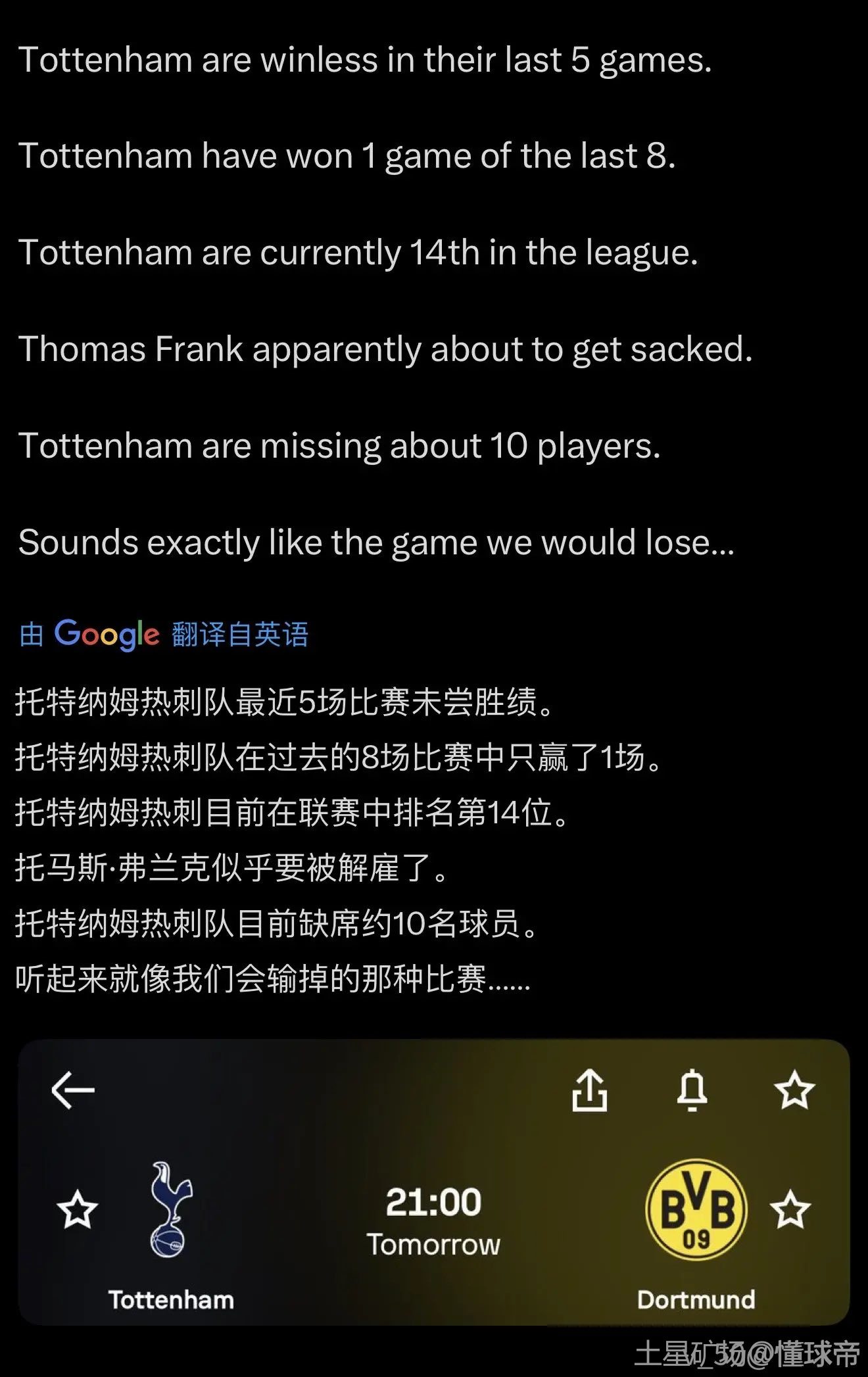 因此,几乎所有当晚身处托特纳姆热刺球场的人,离场时都会认为:他们再也不会看到弗兰克以热刺主帅的身份站在这里了。