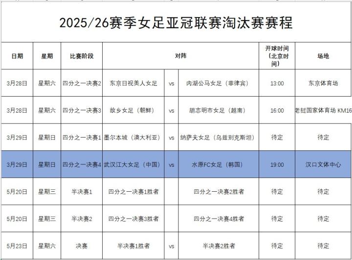 北京时间1月21日,中国足协发布了关于2025/26赛季女足亚冠联赛淘汰赛赛程的通告,其中女足亚冠1/4决赛武汉女足vs水原女足将于3月29日19:00在汉口文体中心进行。