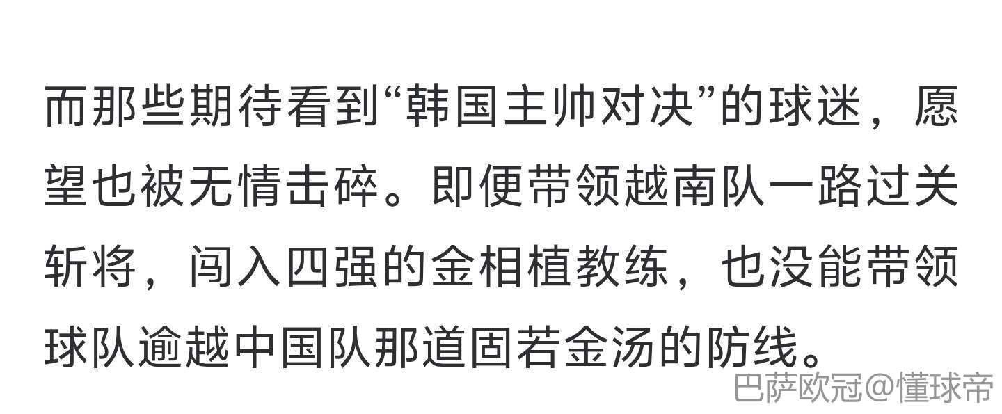 而那些期待看到“韩国主帅对决”的球迷,愿望也被无情击碎。即便带领越南队一路过关斩将,闯入四强的金相植教练,也没能带领球队逾越中国队那道固若金汤的防线。