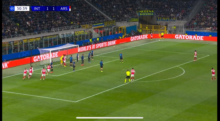 (在角球防守中,国米采用区域防守,可是阿森纳都在后门柱,就等着冲啊)