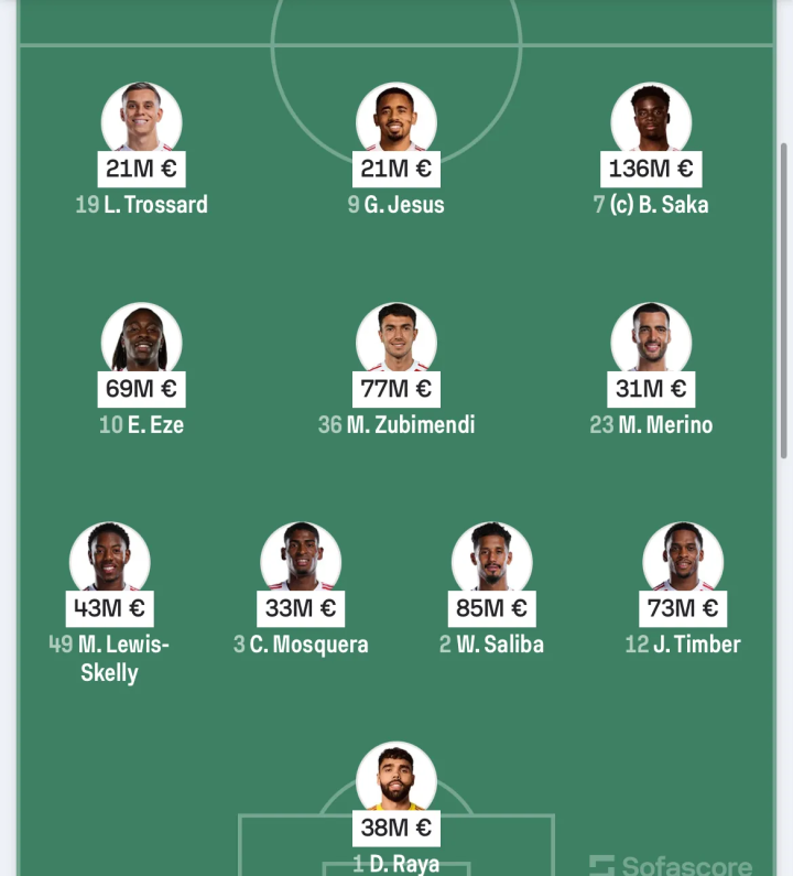 由于已进入欧冠淘汰赛,且几天后要进行与曼联的强强对话,阿尔特塔在首发上进行了大幅轮换,中锋位置上轮换了热苏斯(本场比赛梅开二度),和中场的埃泽、梅里诺,后场的莫斯克拉,但仍能保持强大竞争力,首发阵容的身价达到了6.2亿,平均年龄25.7岁。