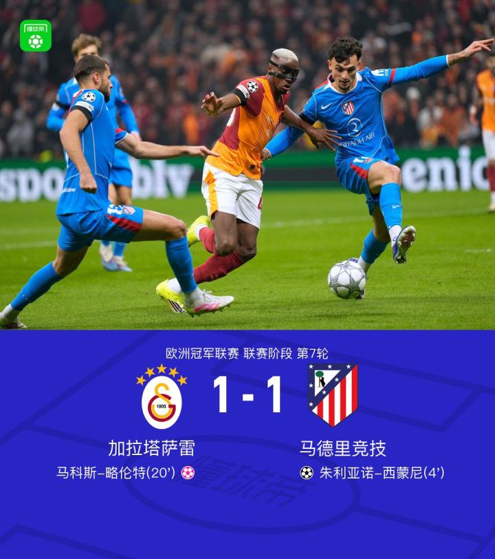 扫描下载懂球帝首页>动态> 马竞客场1-1加拉塔萨雷,朱利亚诺-西蒙尼闪击,略伦特乌龙