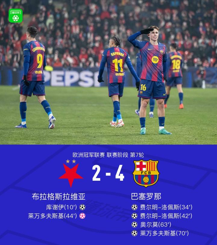 扫描下载懂球帝首页>动态> XbotGo丨巴萨4-2布拉格斯拉维亚,费尔明双响,莱万破门