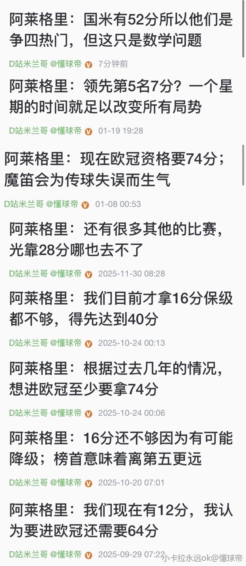 关于国际米兰,我说国际米兰是前四的热门,是因为他们有52分,我认为他们是争冠的热门——和那不勒斯一样——他们在前四名的竞争当中确实有一点优势,但这纯粹是数学问题。