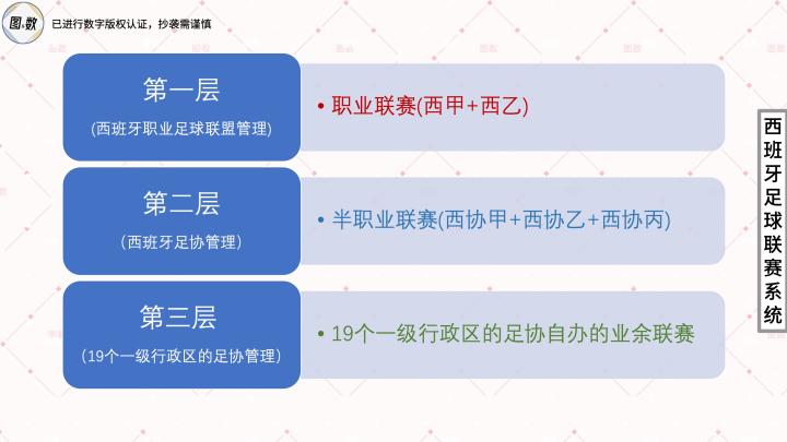 我们在前两期分别发布了西甲地图(20队)和西乙地图(22队),本期将讨论包括西协甲在内的整个西班牙足球联赛系统,它大致可分为三层:第一层是职业联赛,设有西甲和西乙,由西班牙职业足球联盟(Liga Nacional de Fútbol Profesional)运营;第二层是半职业联赛,由西班牙足协运营,分为西协甲、西协乙和西协丙;第三层是第六及以下级别联赛,由西班牙19个一级行政区(17个自治区+2个自治市)的足协自行组织,各地根据自身的具体情况而分设不同级数的赛事,像人口稀少的休达自治市、梅利利亚自治市和拉里奥哈自治区均只有一个级别的联赛,而加泰罗尼亚自治区则有五级联赛(精英级/甲级/乙级/丙级/丁级),排在最低的加泰罗尼亚第五级、即全国第十级的加泰丁设有多达35个平行分组,每组都是十来个队,合在一起意味着仅一项赛事就有大约四百支球队。