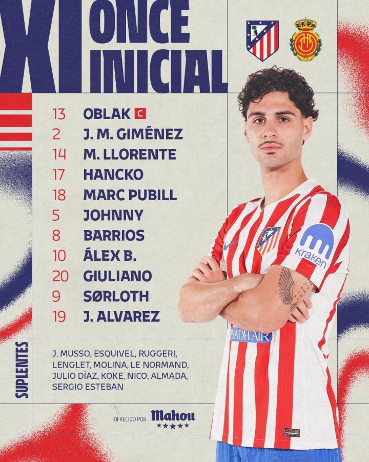 马竞vs马略卡:胡利安-阿尔瓦雷斯、奥布拉克首发,塞尔希-达德尔、韦达特-穆里奇出战