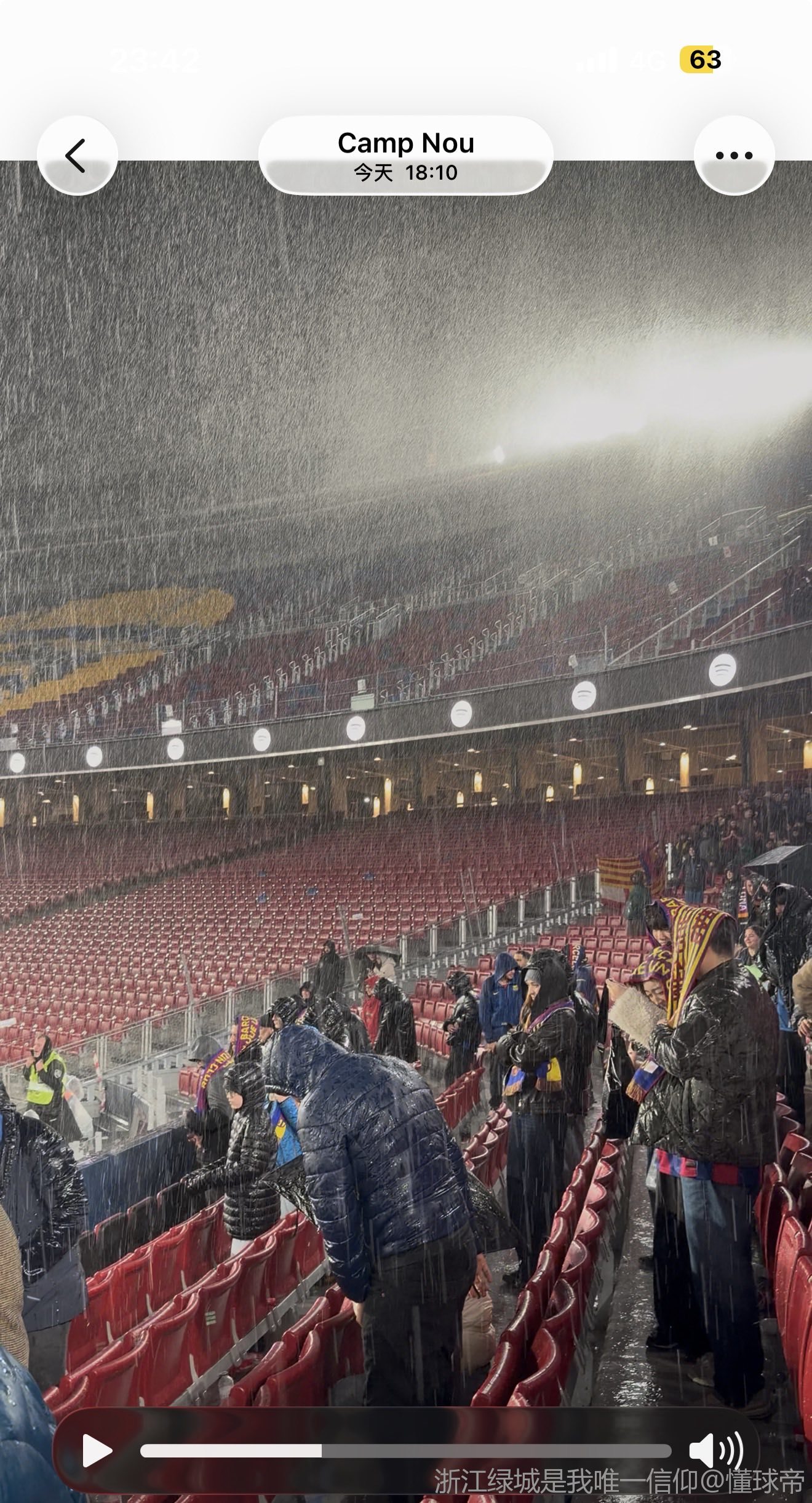 01-26 07:00经历暴雨后,有球迷晒诺坎普顶棚漏水形成一道瀑布