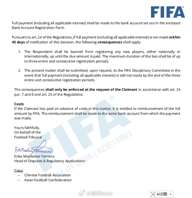 致函中写道,广西平果拖欠外援球员尼卡卡半年工资,拖欠工资为半年,每个月工资为20000欧元,需按照工资发放日后年利率5%支付违约金,在球员工资结清前,广西平果被禁止注册球员,处罚三个转会窗。