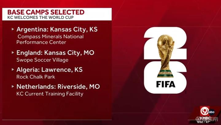 1月25日,据美国堪萨斯城新闻电视9台获悉,阿根廷、英格兰、荷兰以及阿尔及利亚均计划将世界杯大本营设在堪萨斯城都会区。