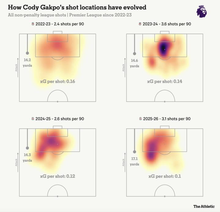 数据同样印证了肉眼所见。加克波下滑的一个关键原因是射门选择。下面的射门分布图显示,他更多选择在禁区左侧边缘、距离较远的位置进行冒险射门,而不是进入更具威胁的中路区域。