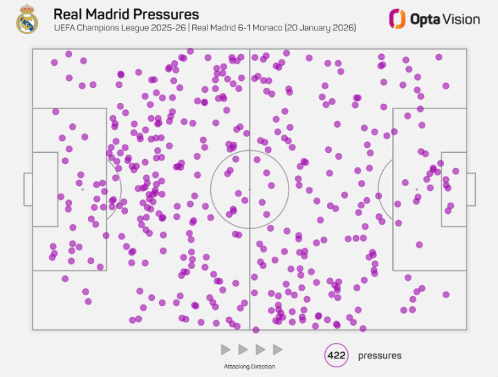 全队高压逼抢达到422次,远高于欧冠场均的363次,说明大家是真拼了。
