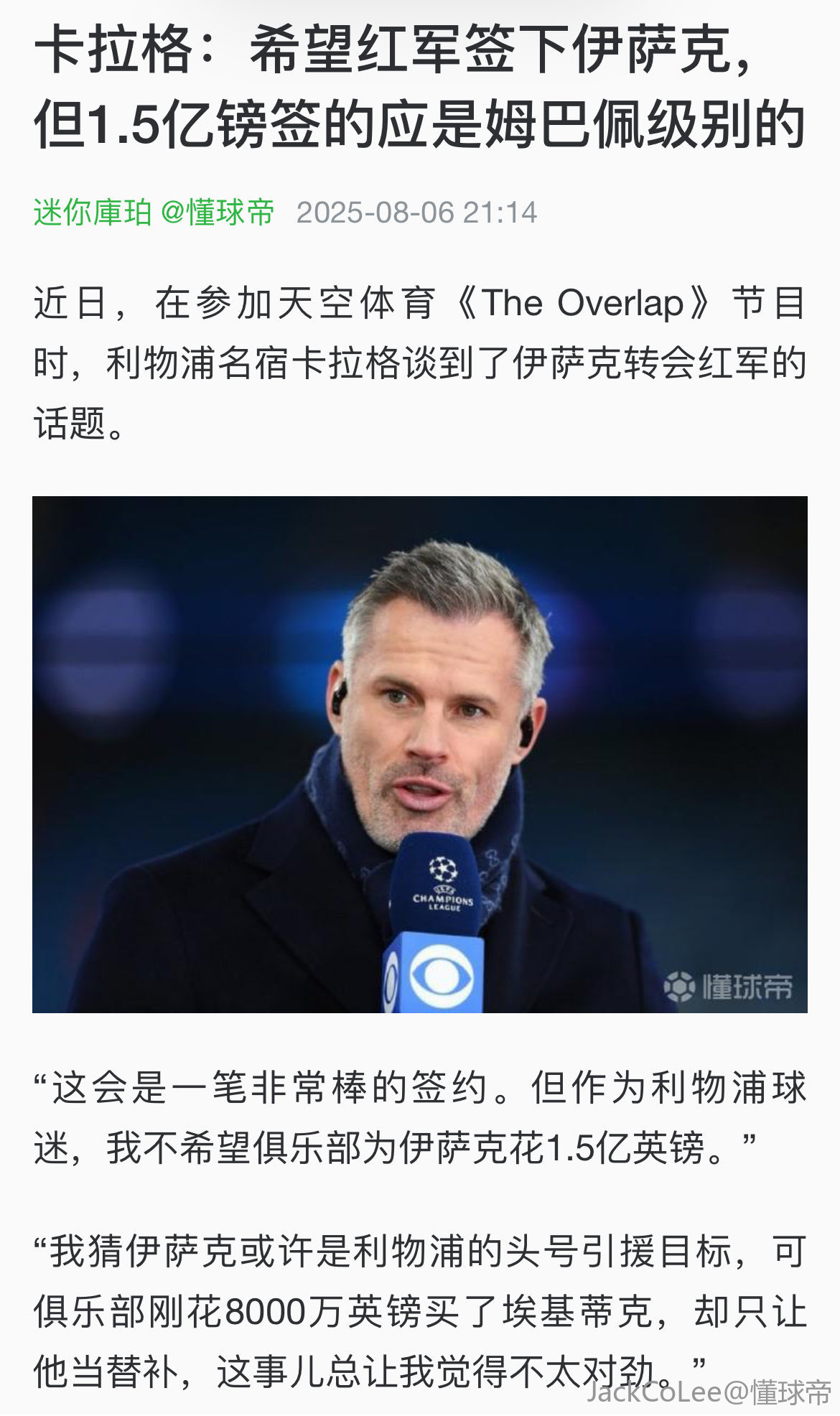 扫描下载懂球帝首页>动态> 卡拉格:至今不懂为什么买伊萨克;无球逼抢才是红军的标志