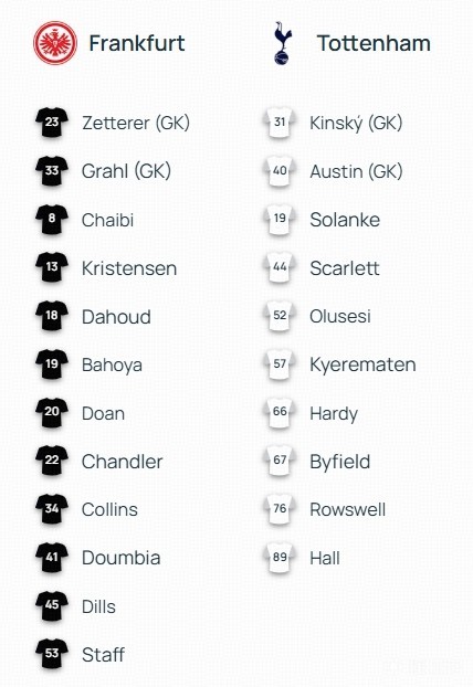 扫描下载懂球帝首页>动态> 热刺客战法兰克福:穆阿尼、哈维-西蒙斯首发,奥多贝尔出战