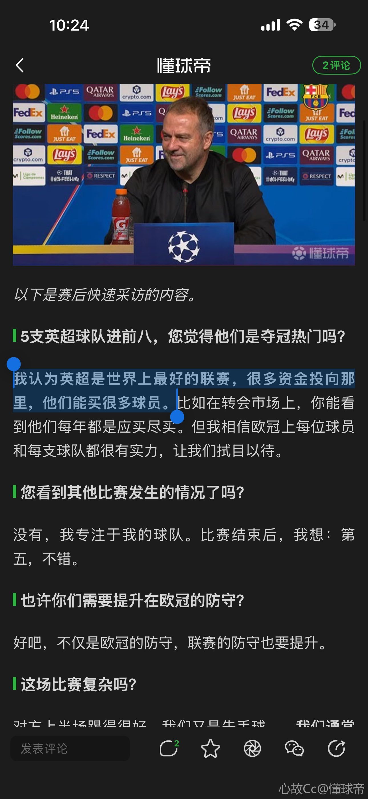 这是欧冠,这很好地体现了这项赛事在改制后是多么有意思。但正如我一直说的,我只关注我的球队,很高兴我们能进前八,我不在乎其他球队是什么情况。