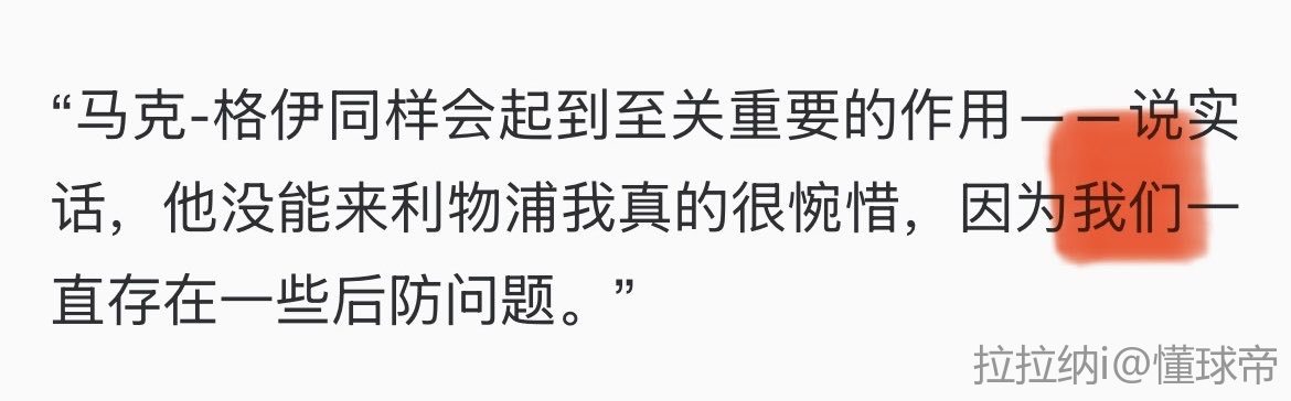 “马克-格伊同样会起到至关重要的作用——说实话,他没能来利物浦我真的很惋惜,因为我们一直存在一些后防问题。”