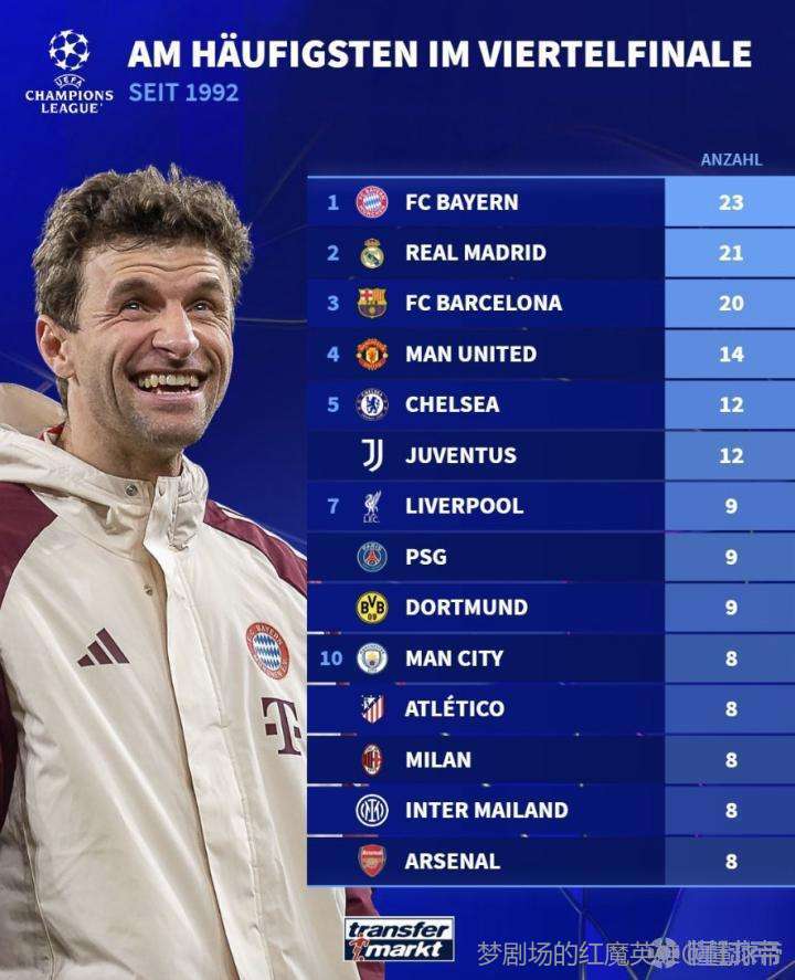 你这数据哪儿来的呀?改制后曼联都14次进入过8强,怎么可能才12次进入16强?曼联虽然这10来年拉了,老本还是挺厚的