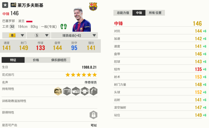 莱万新赛季挺多,要说到最好的,还得是WS版本。这个莱万的手感很灵活,颇有种年轻时的机动性;WS莱万射门能力强、抢点意识出众,头顶脚踢无所不能;和速度偏慢的26TY相比,WS的前插效果更强。