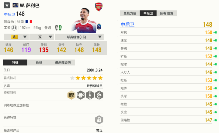 阿森纳套在26TY赛季迎来了新萨利巴,后防线大大加强。萨利巴有出色的身体模型,人高马大、拦截面积广,他还装备了“坚固壁垒”金特性,能频繁拦截对方的射门,让门将变得更轻松。在阿森纳队套里,这张萨利巴成为中坚力量,小伙伴们千万不要错过这张。
