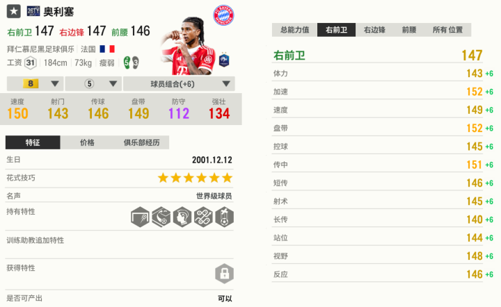 26TY是奥利塞的最强赛季,他的到来让拜仁套右边锋位置更加犀利。奥利塞有着很丝滑的带球手感,可以连续变向和突然加速过人;他的传中是一绝,能精准找到凯恩,这是拜仁套进攻的高效率手段。