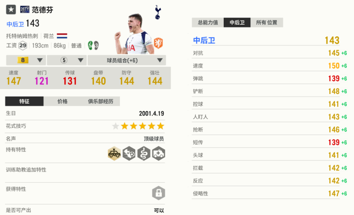 26TY范德芬的到来,给了热刺套超级加强。这张卡有非常好的对抗性;装备了“捍卫者”金特性,他还能高速回防破坏对方的单刀。和其他强力中后卫比较起来,26TY范德芬也不落下风。
