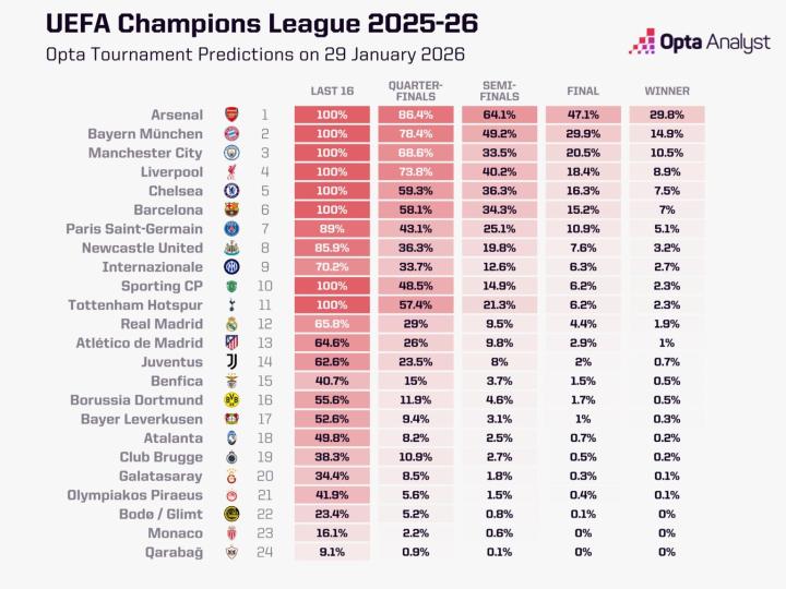 扫描下载懂球帝首页>动态> Opta更新欧冠夺冠概率:阿森纳29.8%,拜仁14.9%,曼城10.5%