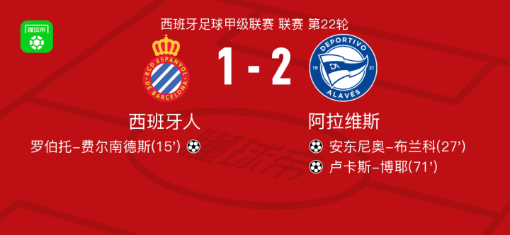 半场战报:西班牙人1-1阿拉维斯,罗伯托-费尔南德斯,安东尼奥-布兰科建功