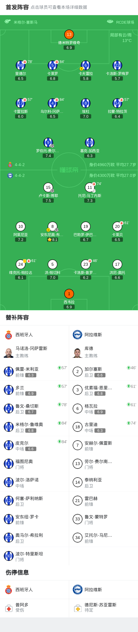 01-31 04:50西班牙人vs阿拉维斯:基克-加西亚、卡夫雷拉首发,阿莱尼亚、洪尼-奥托出战