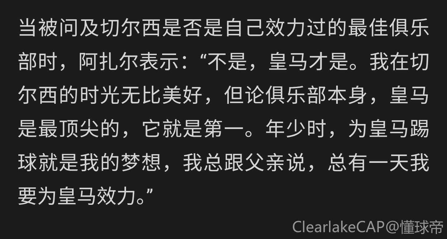 这说的不是俱乐部层面来说,皇马是是第一吗?又不说对切尔西的感情少于皇马,或者说在皇马更快乐,这又什么好说的。我是车迷我也不敢说切尔西是世界第一俱乐部啊