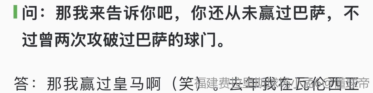 问:那我来告诉你吧,你还从未赢过巴萨,不过曾两次攻破过巴萨的球门。