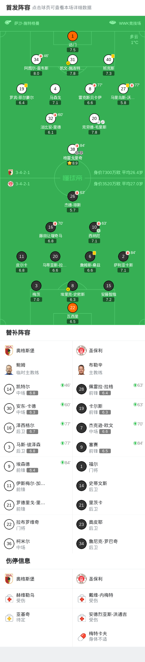 奥格斯堡vs圣保利:马里乌斯-沃尔夫、格雷戈里奇首发,藤田让瑠奇马、梅茨出战