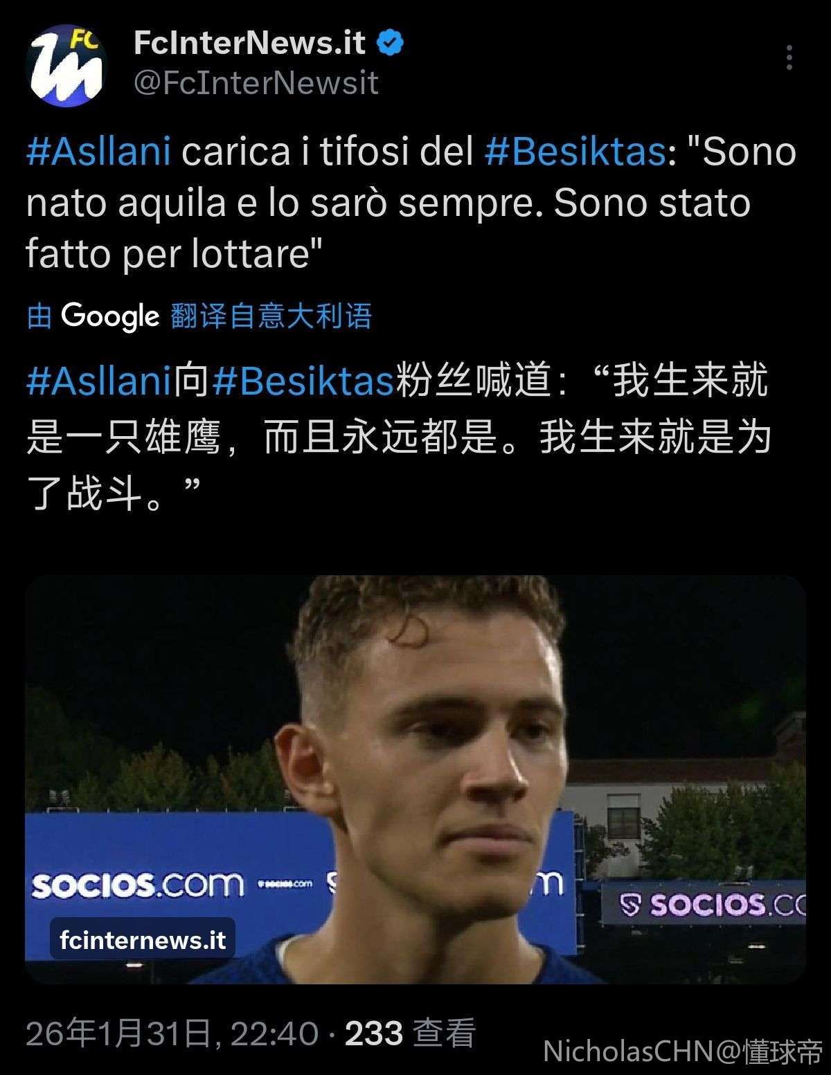 02-01 07:38阿斯拉尼身披贝西克塔斯战袍的首秀只持续了短短6分...