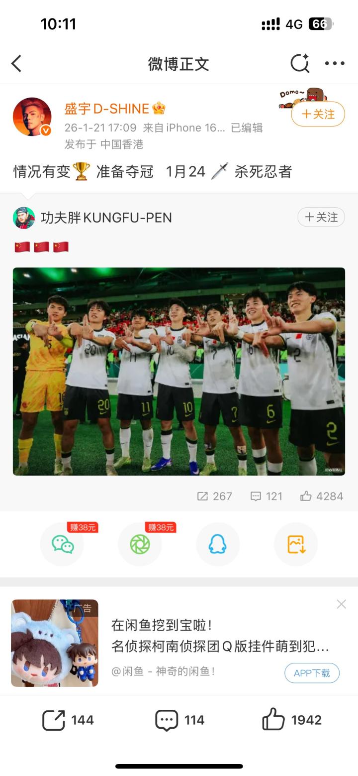面对球员的盛情互动,C-BLOCK的成员们在社交平台上予以回应,盛宇直言:“情况有变,准备夺冠,1月24,杀死忍者。”功夫胖则是言简意赅地以三面国旗祝贺U23小伙创造佳绩,此外,与C-BLOCK相交甚好的知名rapper GAI也在川渝春晚的演出后台向U23小伙送上祝福。