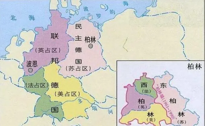 1949年,美英法区合并成为一个国家——德意志联邦共和国,即西德。苏占区成立了民主德国,即东德。