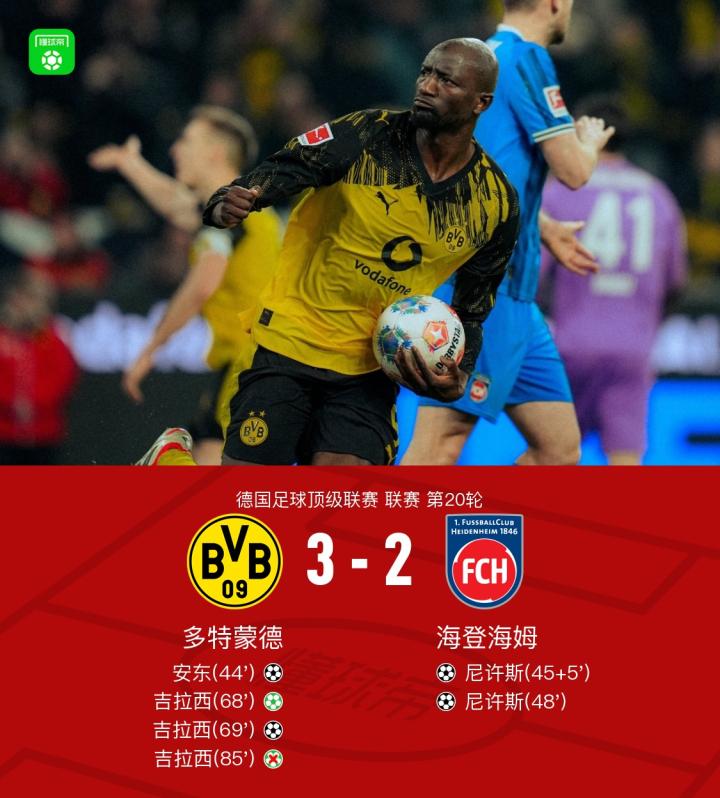 视频集锦:多特蒙德3-2海登海姆,吉拉西双响+丢点