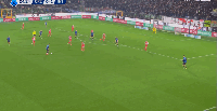 国米上半场控球率75%,射门11次,传球成功次数302次,是对手的5倍,两队的对抗只有36次,国米稳稳控制住了比赛的局面,第16分钟,迪马尔科开出左侧角球,劳塔罗禁区内力压防守球员头球破门,为国米首开记录。