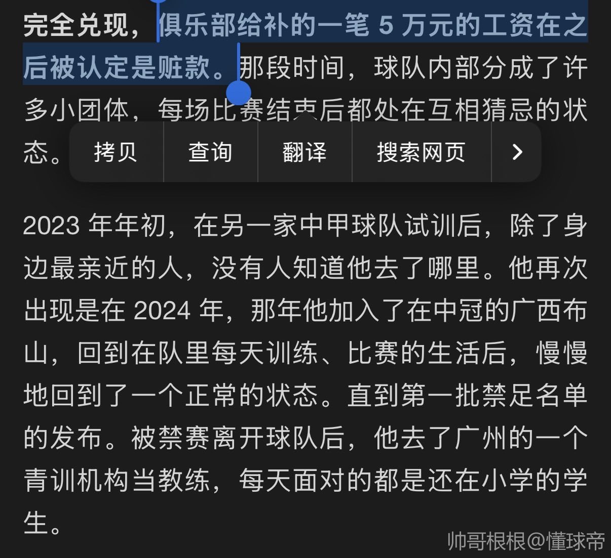 前面都是写过的怎么不如意,找了半天禁足原因,中间就提了一小嘴,因为拿了俱乐部的工资被终生禁足,这要是真的还有王法吗,再黑这个理由也牵强了吧,这个还主要是公安部负责,足协是配合的,我感觉是罗生门,只说了对自己有利的信息。