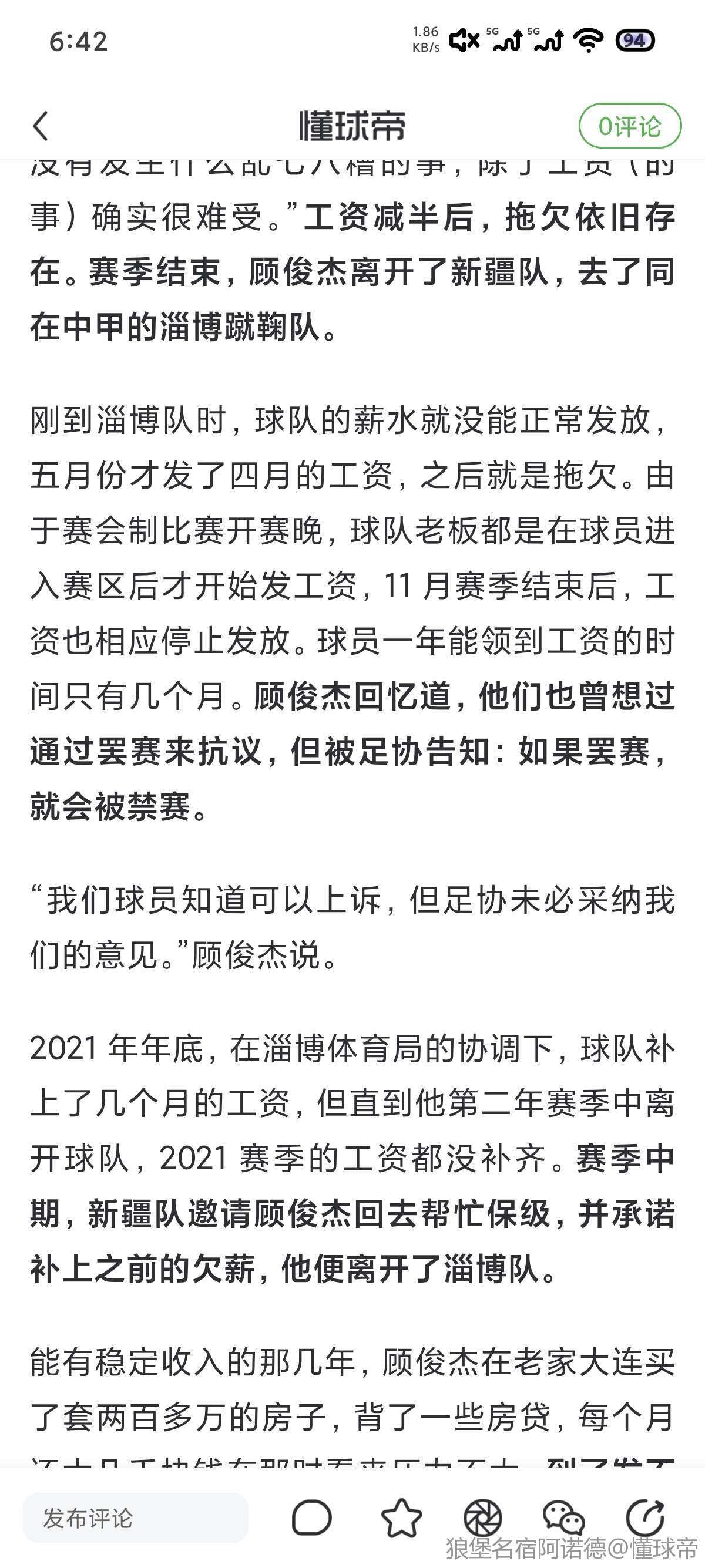 “(2022年)我已经在淄博队了,新疆那段时间新换了老板,跟我说球队想保级,回去能解决我之前在新疆踢球时的欠薪。当时淄博欠的(薪水)比新疆还严重, 2022 年的前几个月我一分钱都没收到,于是我就回去了。”顾俊杰说。回到新疆后,情况并没有按老板所承诺的发展,薪水依旧不能按时发放。