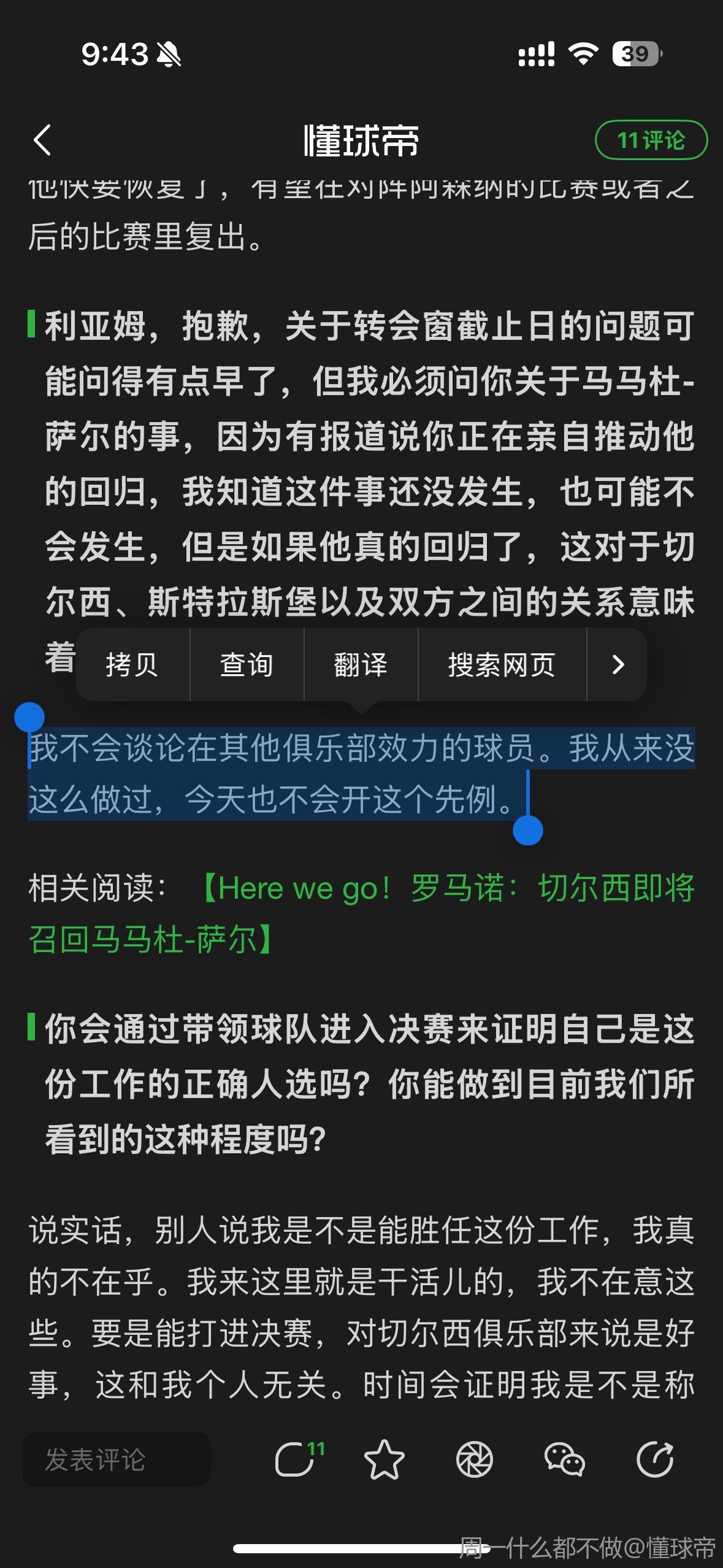 说实话,别人说我是不是能胜任这份工作,我真的不在乎。我来这里就是干活儿的,我不在意这些。要是能打进决赛,对切尔西俱乐部来说是好事,这和我个人无关。时间会证明我是不是称职,但这不是我现在最关心的事。
