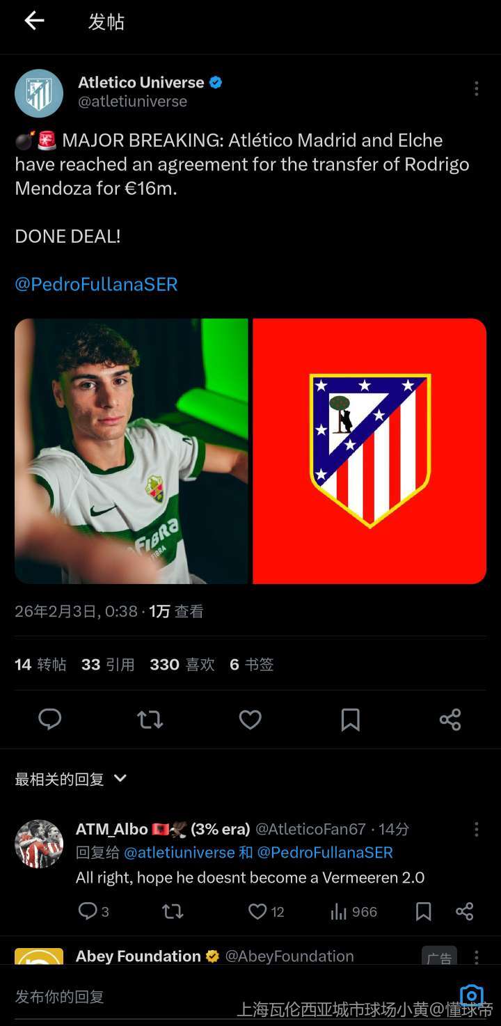 02-02 23:33Here we go!罗马诺:马竞将签下20岁墨西哥中场巴尔加斯