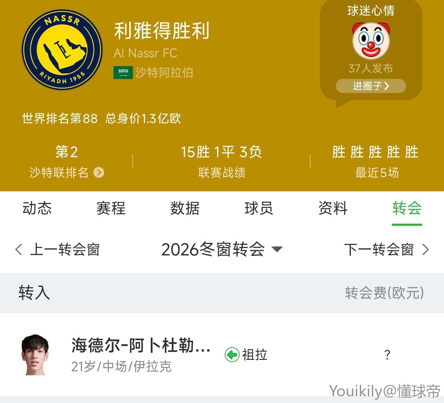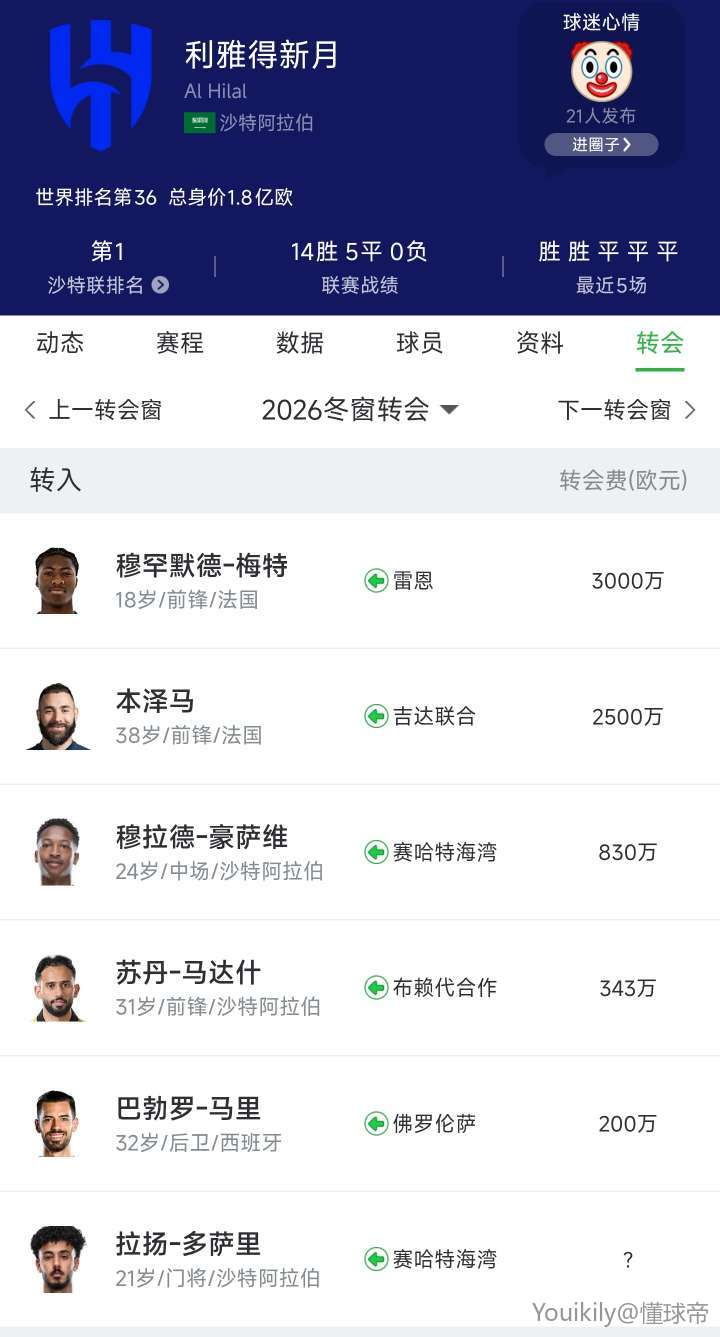 可现实却事与愿违,球队冬窗唯一的新援,只是21岁的伊拉克中场阿卜杜勒卡里姆。反观利雅得新月,已斥巨资签下巴勃罗-马里、穆罕默德-梅特和本泽马等一众球星,引援力度远超对手。