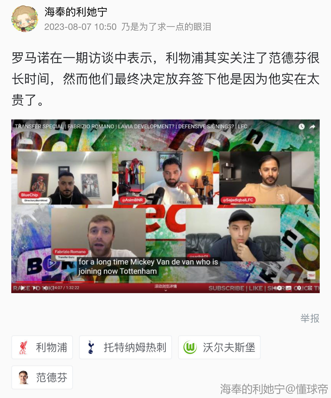 总之有意的得先报价,毕竟你们大俱乐部都有钱,范德文还有3年合同1个e真不贵,觉得贵那就再等一年,利物浦和曼联是真有钱,报价不高那就没想真要,一个买个20岁小孩肯花6000w榜,一个买马奎花8000w,给范德文花1e怎么了