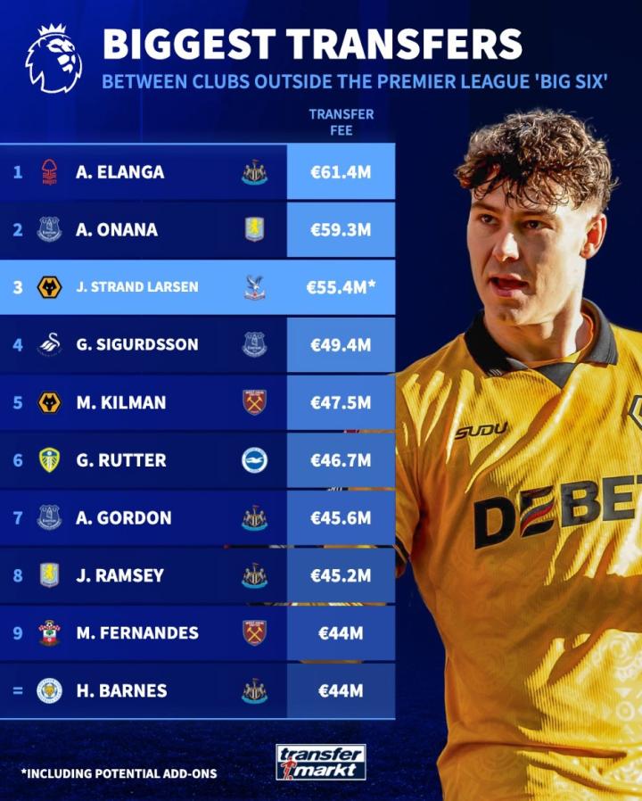 02-02 20:04冬窗转会榜:塞门约7200万欧标王,雅凯6360万欧次席