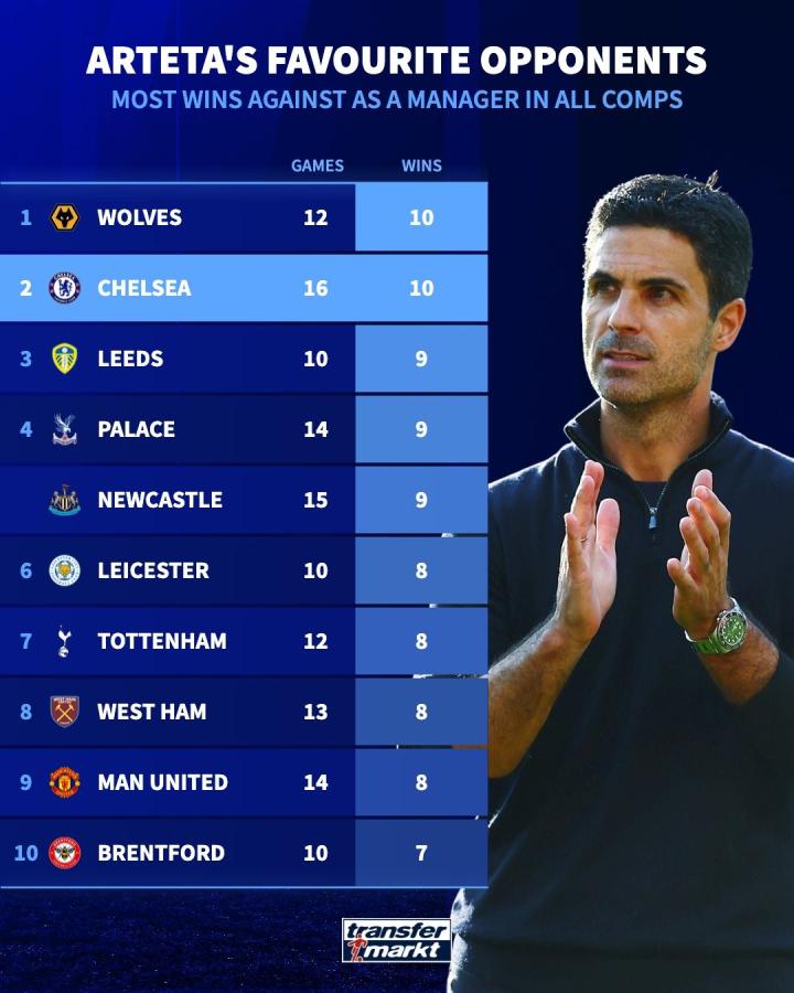 扫描下载懂球帝首页>动态> 喜欢的对手,切尔西是阿尔特塔赢球最多的球队,16场取得10胜