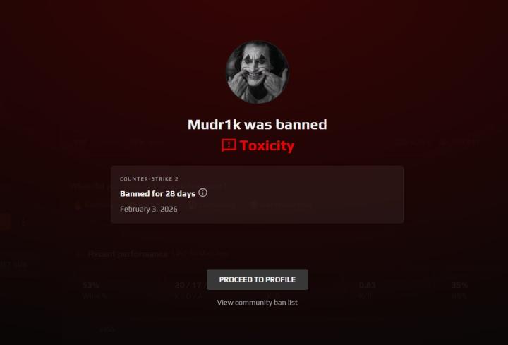 穆德里克在2024年底被查出服用禁药,遭到了禁赛四年的处罚。由于无法上场比赛,他最近已经转战《反恐精英》游戏,并在最近几个月参加了约600局游戏。但由于游戏中的违规行为,他遭到了封号一个月的处罚。